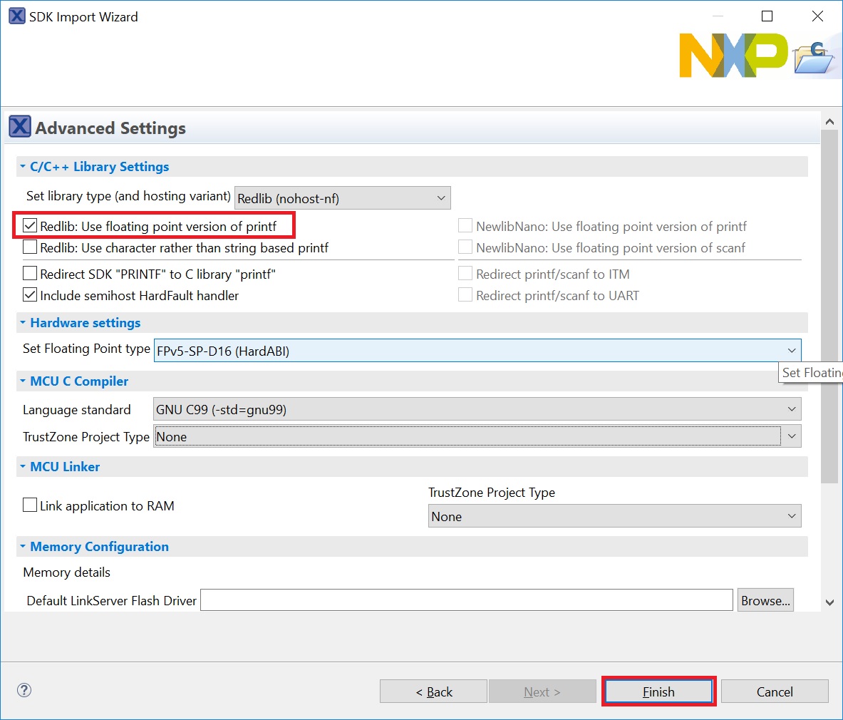 Ensure Redlib: Use floating-point version of printf is selected if the example prints floating-point numbers on the terminal. Otherwise, it is not necessary to select this option. Then, click Finish.