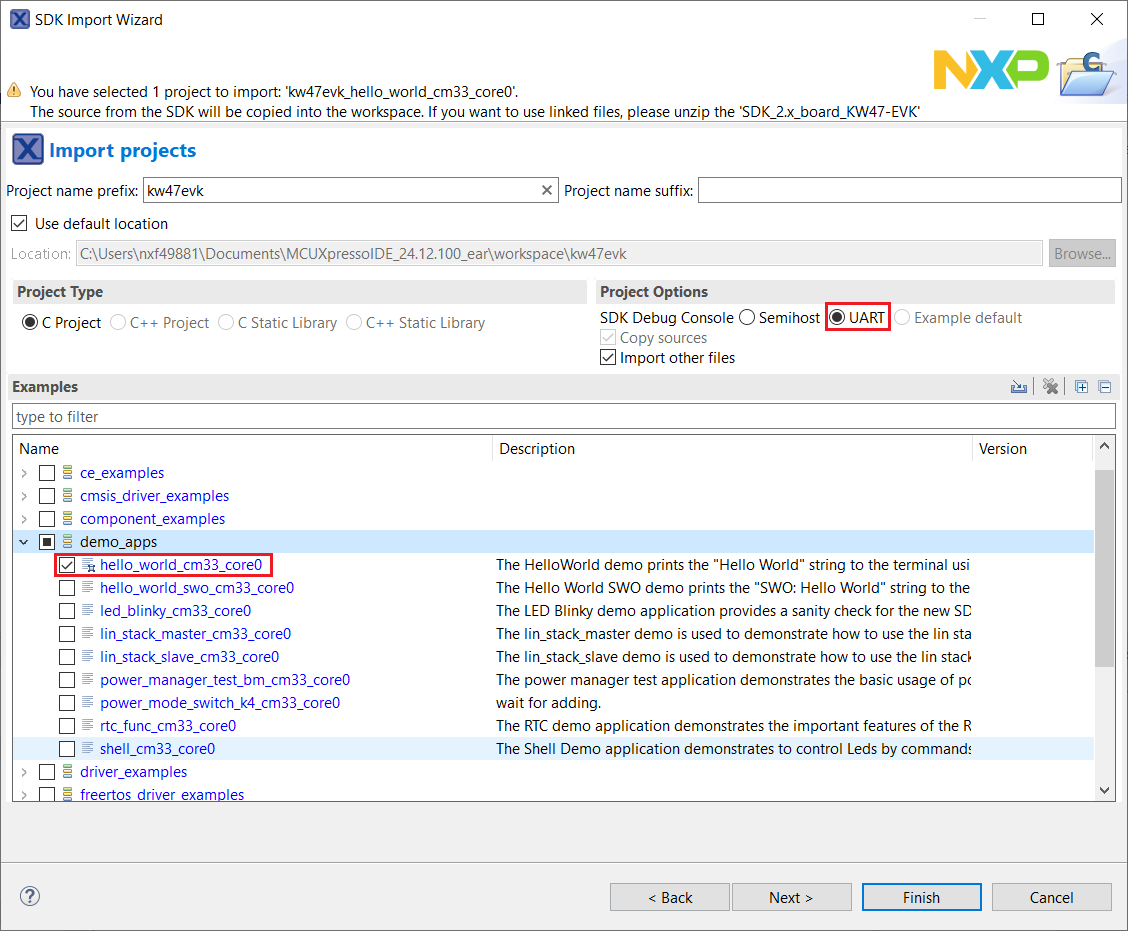 This section describes the steps required to configure MCUXpresso IDE to build, run, and debug example applications. The hello_world demo application targeted for the KW47-EVK hardware platform is used as an example, though these steps can be applied to any example application in the MCUXpresso SDK.