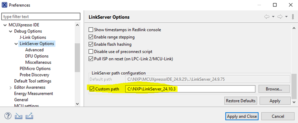 The latest MCUX IDE 24.9.25 cannot support KW47 multicore compiling, users need to upgrade to the Linkserver_24.10.22 or higher version, and change the LinkServer path configuration in the MCUX IDE. Two ways to change the LinkerSever path in the MCUX IDE.