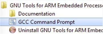 1. If not already running, open a GCC Arm Embedded tool chain command window. To launch the window, from the Windows operating system Start menu, go to Programs -> GNU Tools Arm Embedded <version> and select GCC Command Prompt.