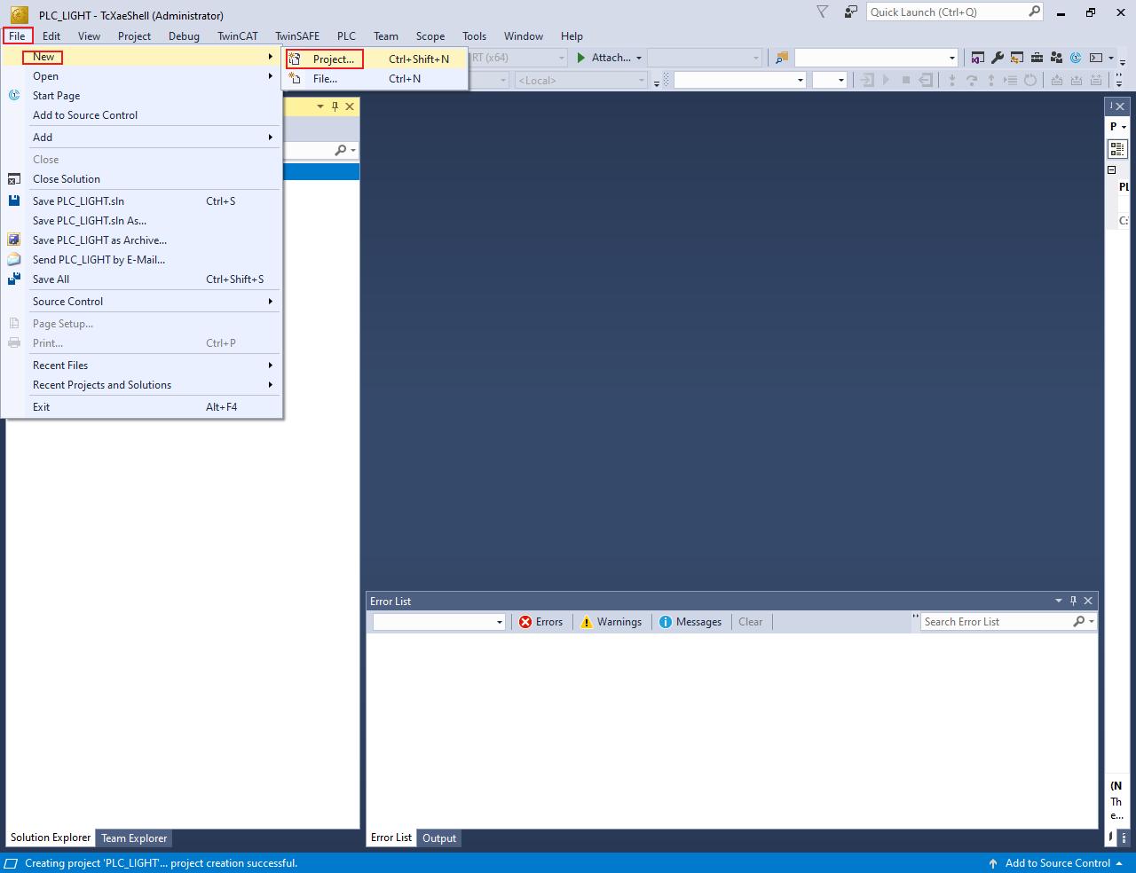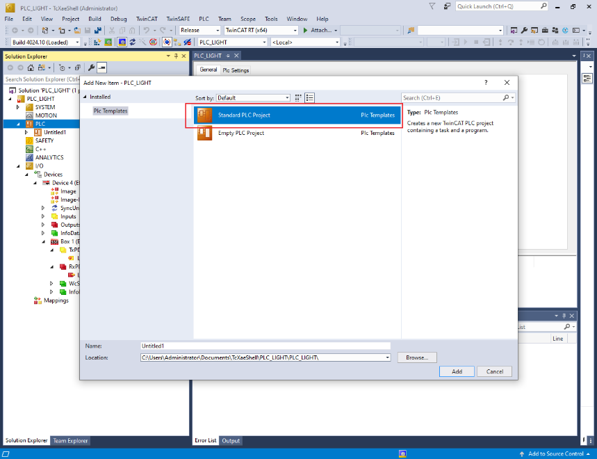 In the Solution Explorer view, right-click on PLC and select Add New Item.