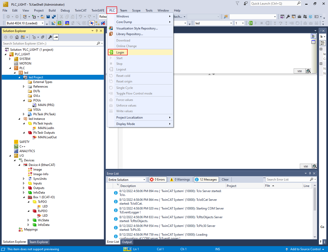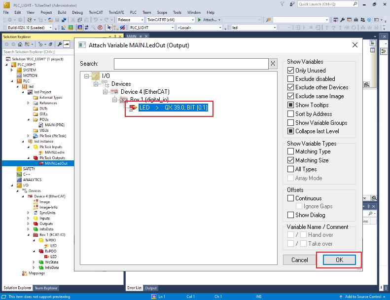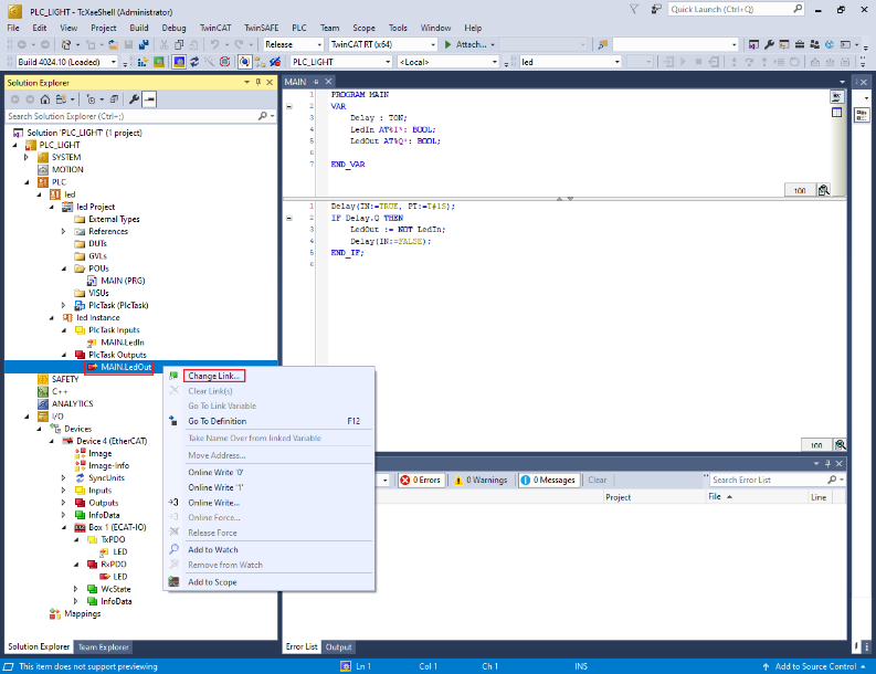 In the Solution Explorer, under PlcTask Outputs, right-click on MAIN.LedOut and select Change Link.