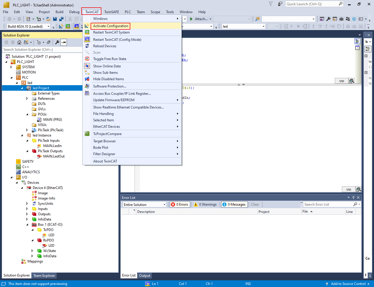 To activate the configuration, select TwinCAT > Activate Configuration.