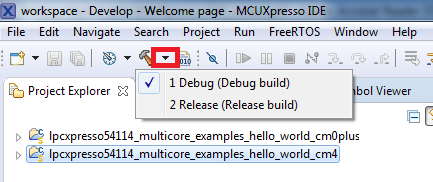 3. Now, two projects should be imported into the workspace. To start building the multicore application, highlight the lpcxpresso54114_multicore_examples_hello_world_cm4 project (multicore master project) in the Project Explorer. Then choose the appropriate build target, Debug or Release, by clicking the downward facing arrow next to the hammer icon, as shown in the figure. For this example, select Debug.