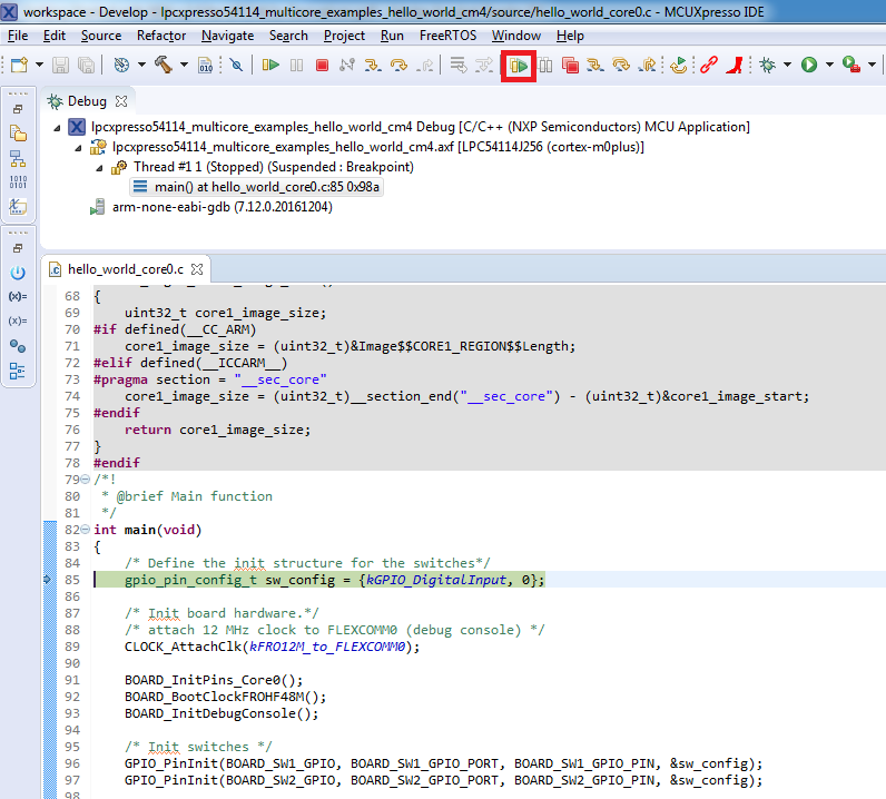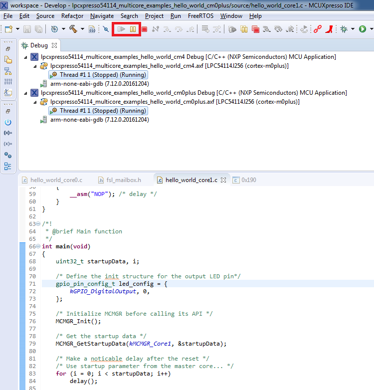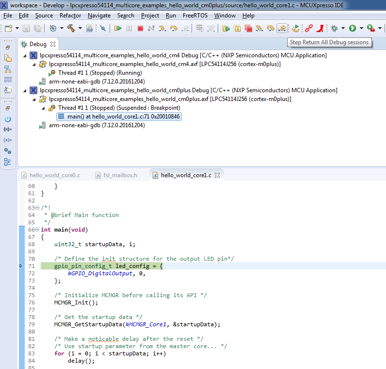 An LED controlled by the auxiliary core starts flashing, indicating that the auxiliary core has been released from the reset and running correctly. It is also possible to debug both sides of the multicore application in parallel. After creating the debug session for the primary core, perform same steps also for the auxiliary core application. Highlight the lpcxpresso54114_multicore_examples_hello_world_cm0plus project (multicore slave project) in the Project Explorer. On the Quickstart Panel, click “Debug ‘lpcxpresso54114_multicore_examples_hello_world_cm0plus’ [Debug]” to launch the second debug session.