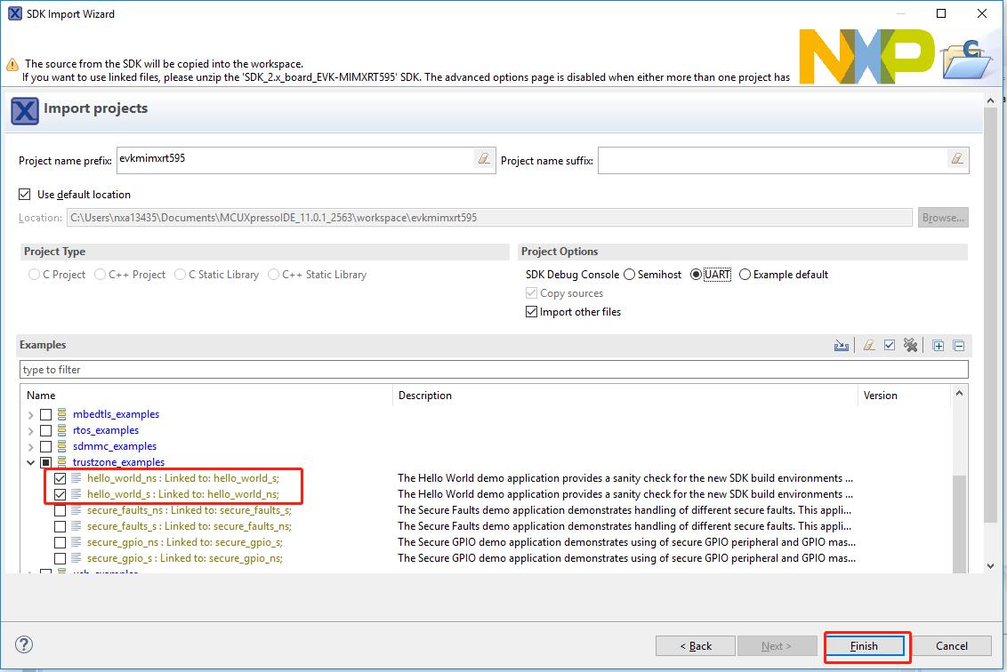 This section describes the steps required to configure MCUXpresso IDE to build, run, and debug TrustZone example applications. The TrustZone version of the hello_world example application targeted for the MIMXRT595-EVK hardware platform is used as an example, though these steps can be applied to any TrustZone example application in the MCUXpresso SDK.