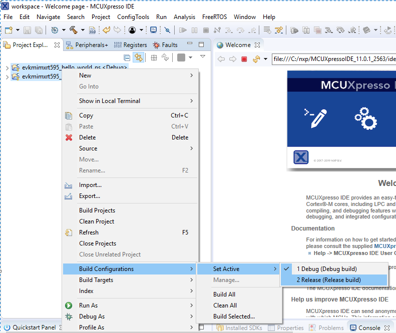 Note: When the Release build is requested, it is necessary to change the build configuration of both the secure and non-secure application projects first. To do this, select both projects in the Project Explorer view by clicking to select the first project, then using shift-click or control-click to select the second project. Right click in the Project Explorer view to display the context-sensitive menu and select Build Configurations > Set Active >Release. This is also possible by using the menu item of Project > Build Configuration >Set Active >Release. After switching to the Release build configuration. Build the application for the secure project first.