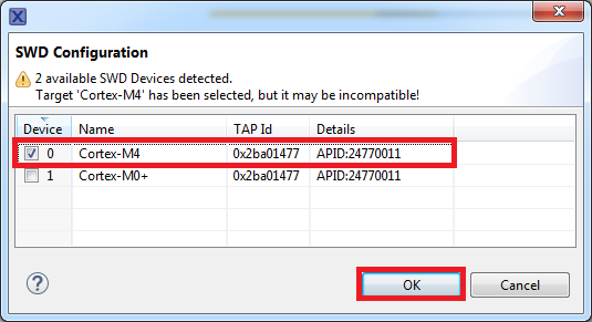 The primary core debugger handles flashing of both the primary and the auxiliary core applications into the SoC flash memory. To download and run the multicore application, switch to the primary core application project and perform all steps as described in Run an example application. These steps are common for both single-core applications and the primary side of dual-core applications, ensuring both sides of the multicore application are properly loaded and started. However, there is one additional dialogue that is specific to multicore examples which requires selecting the target core. See the following figures as reference.