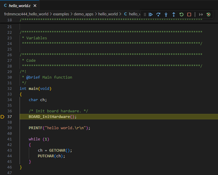 This section explains how to configure MCUXpresso for VS Code to build, run, and debug example applications. This guide uses the hello_world demo application as an example. However, these steps can be applied to any example application in the MCUXpresso SDK.