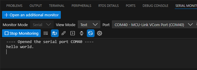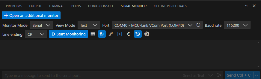 Open the Serial Monitor from the VS Code’s integrated terminal. Select the VCom Port for your device and set the baud rate to 115200.