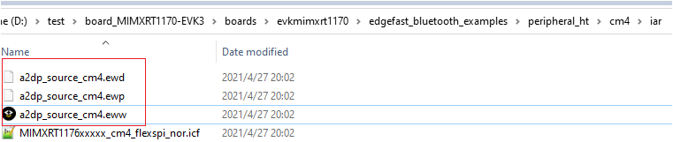 Open the folder iar in the directory <install_dir>boards\evkmimxrt1170\edgefast_bluetooth_examples\peripheral_ht\cm4\iar.
