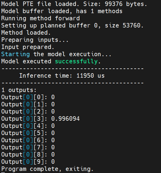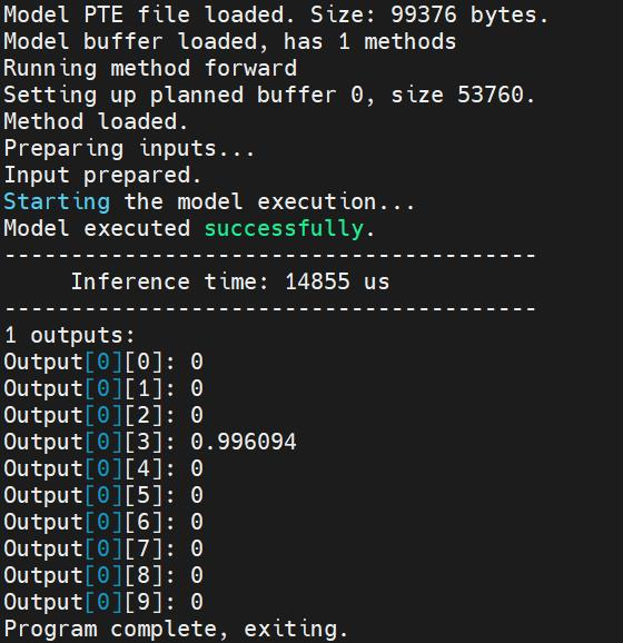After building the example application and downloading it to the target, the execution stops in the main function. When the execution resumes, an output message displays on the connected terminal. For example, Figure 6 shows the output of the executorch_cifarnet example application.