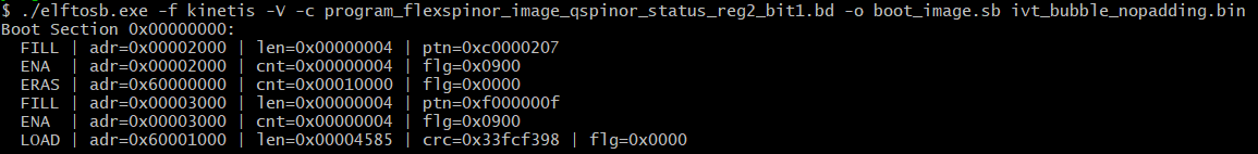 After the command “program_flexspinor_image_encrypt.bd -o boot_image.sb ivt_flexspi_nor_xip_signed_nopadding.bin” in the figure above , a file named “boot_image.sb” is generated in the folder that contains the elftosb utility executable.