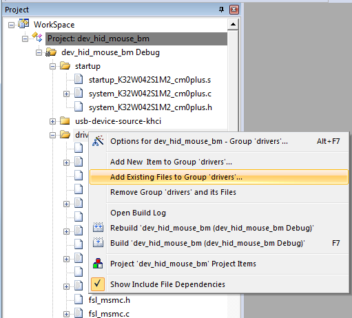 Add int-mux file to M0p project, driver -add Exiting Files to Group ‘driver’, as shown in the image bellow