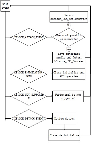 Application needs to implement one or more functions to correspond to one class process. These application functions are called in the USB_HostEvent. The device’s configuration handle and interface list are passed to the application through the function so that the application can determine whether the device is supported by this application.