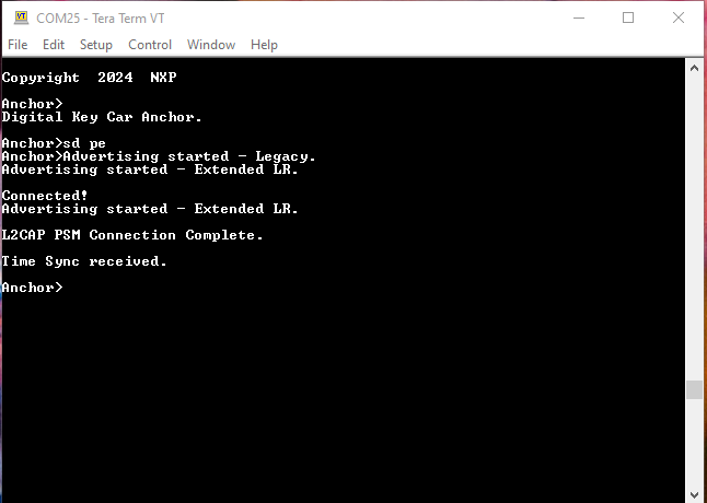 After reset, run the “sd pe” command on the Car Anchor and “sd” command on the Device as shown in Figure 1 and Figure 2. For the Passive Entry scenario, the Car Anchor advertises using two sets, one Legacy on the 1M PHY and one Extended on the Coded PHY. If bonding data is present, it follows the Passive Entry flow and stops after the successful creation of the L2CAP channel. At this point the application is functional. The output of the command is shown in Figure 1 and Figure 2. Similar to the Owner Pairing scenario, the applications implement only the Bluetooth Low Energy functionality.