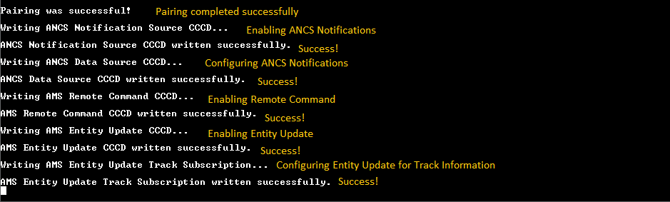 If any security-related ATT errors are encountered, then the application automatically performs Pairing and Bonding and retries the failed ATT operations. Depending on the negotiated pairing method, user interaction might be needed to complete the Pairing. Follow the onscreen instructions provided by both the ANCS/AMS Client and the mobile device. If the ANCS/AMS Client generates a passkey, then the default 999999 passkey is used. See the figure below that shows a ‘Pairing is successful’ message.