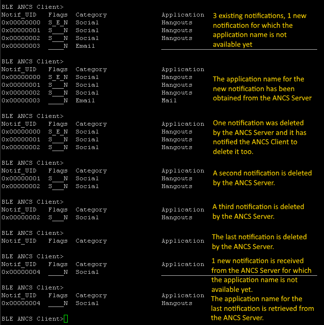 Once connected to a mobile device offering the ANCS/AMS Service, the application displays information about ANCS Notifications received from that device. This information is followed by the AMS track information (Artist, Album, Title, Duration in seconds). The application also displays the possible remote commands that the device state allows (such as Play, Pause, VolumeUp, VolumeDown). The notifications are received via ATT Notifications, for which the ANCS Client must register on the peer ANCS Server. The same must be done for the AMS server. It initially configures the information that it wants to be notified about. The application also retrieves and displays additional information about the received ANCS notifications. For this purpose, it writes commands to specified characteristics on the ANCS/AMS Server and receives responses via ATT Notifications from other characteristics. All information is displayed to the user using a shell available over a serial communications interface.