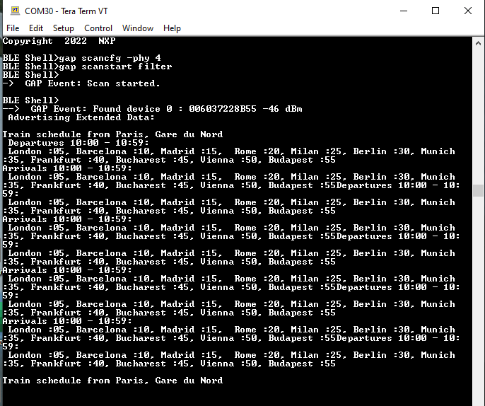 Not all smartphones support extended advertising, hence a different method to view the AE beacon is to use the ble_shell application. In order to do this, perform the following steps: