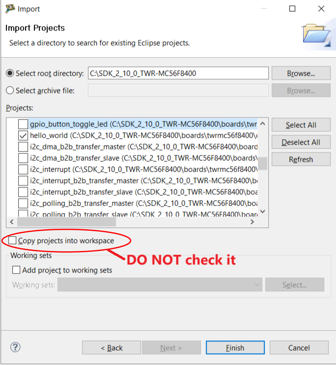 Import the project into the workspace. Click Import project in the Commander pane. A form pops up. Click Browse to the SDK install directory. Take TWR-MC56F8400 SDK as an example, all available demo projects are shown. Select the
