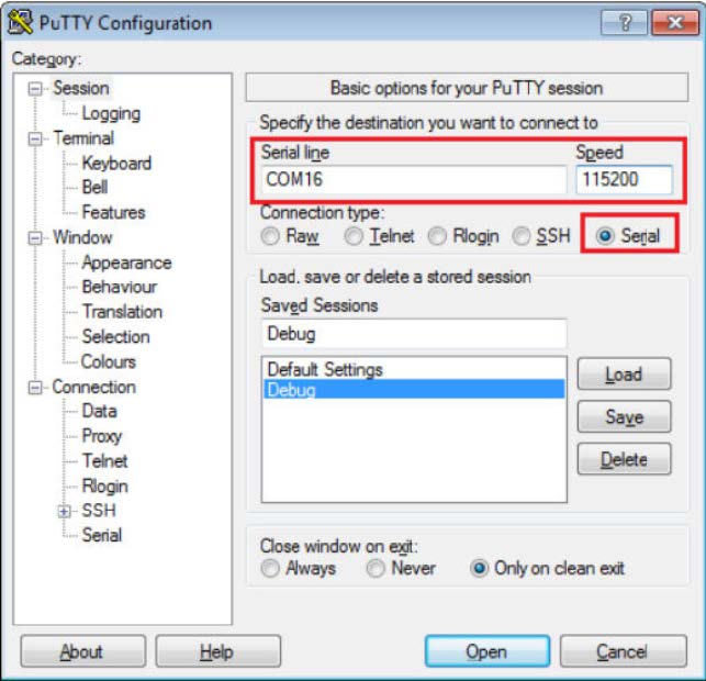 Open the terminal application on the PC, such as PuTTY or TeraTerm, and connect to the debug COM port (see How to determine COM port). Configure the terminal with these settings: