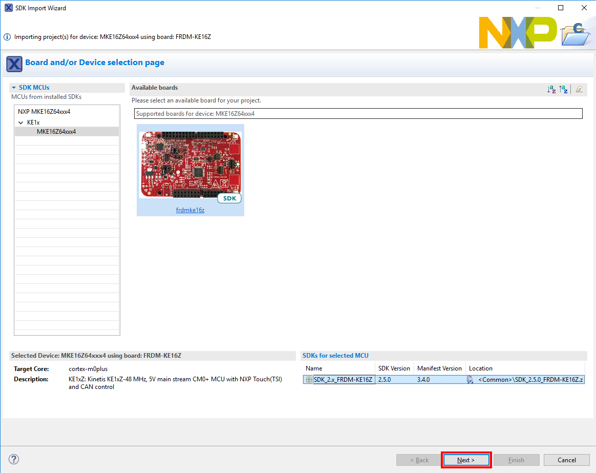 In the window that appears, expand the KE1x folder and select MKE16Z64xxx4 . Then, select frdmke16z and click Next.