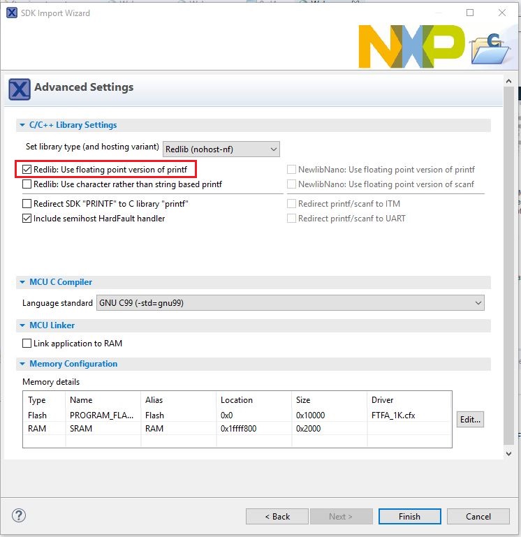 Ensure Redlib: Use floating point version of printf is selected if the example prints floating point numbers on the terminalfor demo applications such as