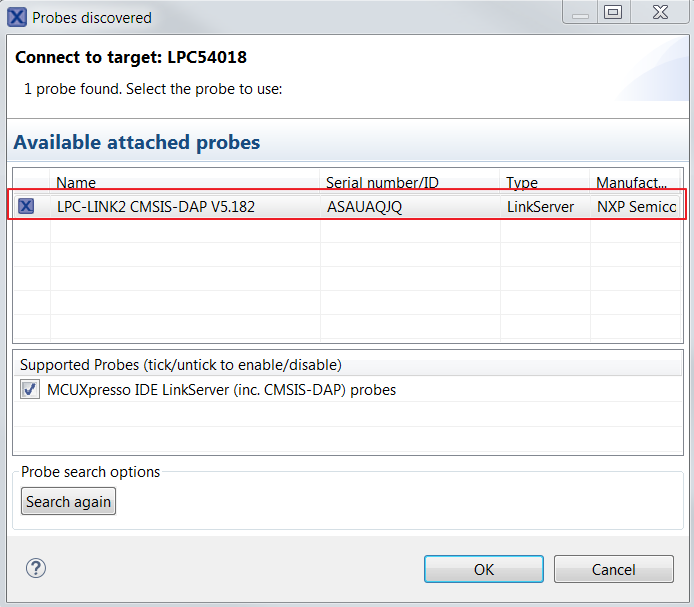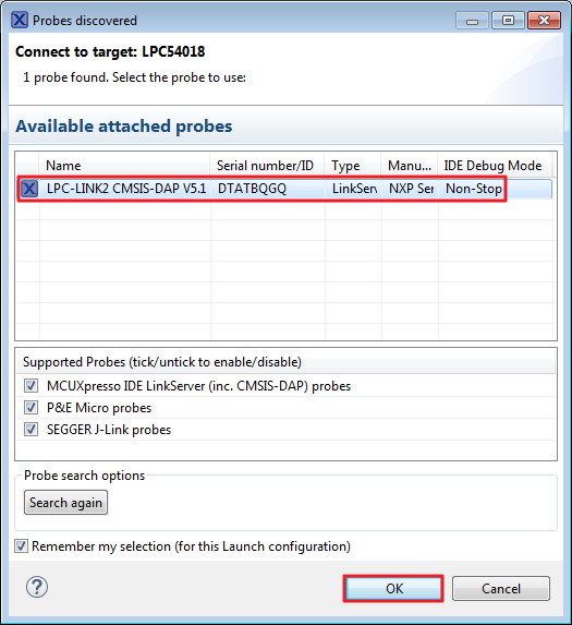 The first time you debug a project, the Debug Emulator Selection Dialog is displayed, showing all supported probes that are attached to your computer. Select the probe through which you want to debug and click the “OK” button. (For any future debug sessions, the stored probe selection is automatically used, unless the probe cannot be found.)