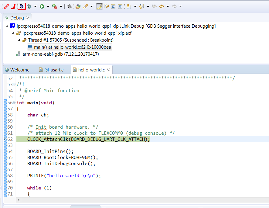 On the Quickstart Panel, click on “Debug ‘lpcxpresso54018_demo_apps_hello_world’ [Debug]”.