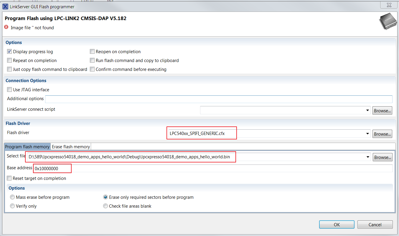 Select the flash driver, bin file, and external flash program address, then click the “OK” button to program the bin file to external flash.