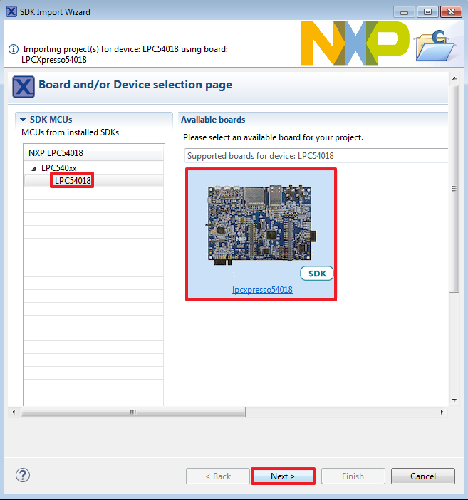 In the window that appears, expand the “LPC540xx folder and select “LPC54018” . Then, select “lpcxpresso54018” and click the “Next” button.