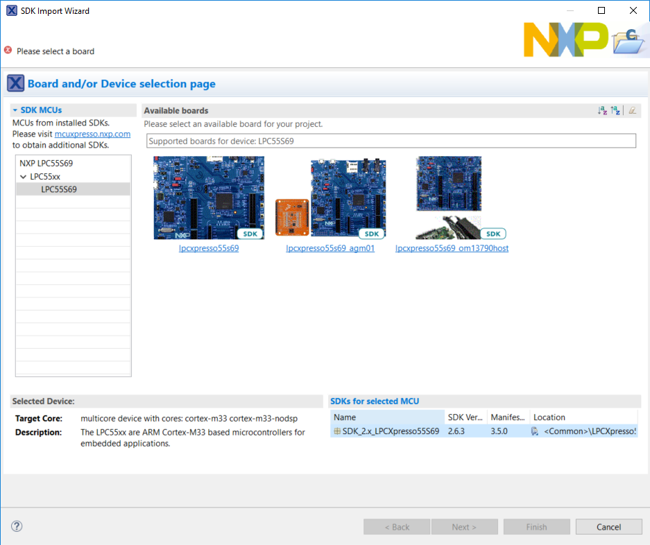 In the window that appears, expand the LPC55xx folder and select LPC55S69. Then, select lpcxpresso55s69 and click Next.