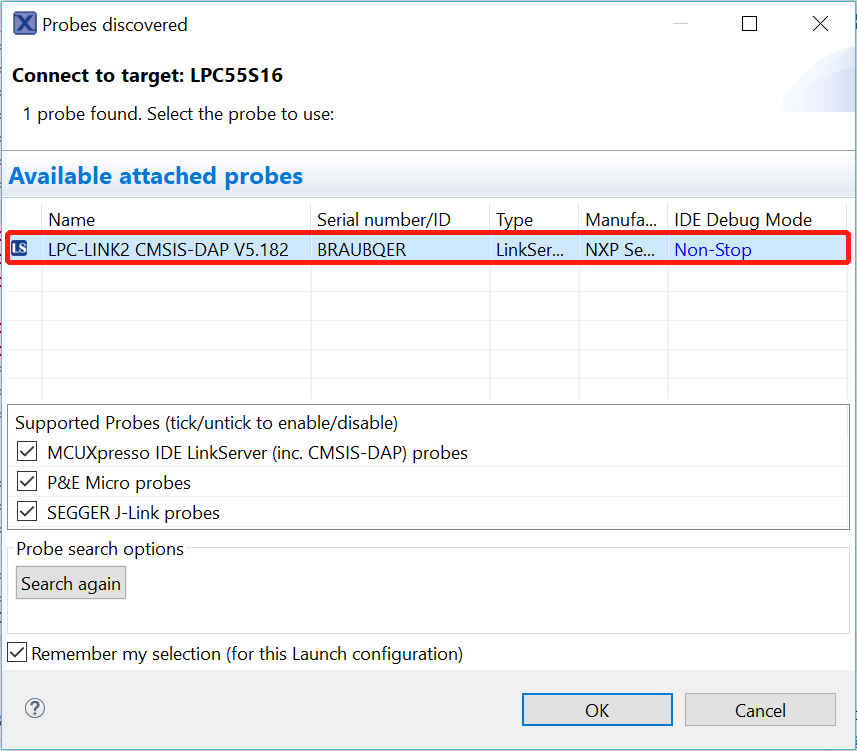 The first time you debug a project, the Debug Emulator Selection dialog is displayed, showing all supported probes that are attached to your computer. Select the probe through which you want to debug and click OK. (For any future debug sessions, the stored probe selection is automatically used, unless the probe cannot be found.)