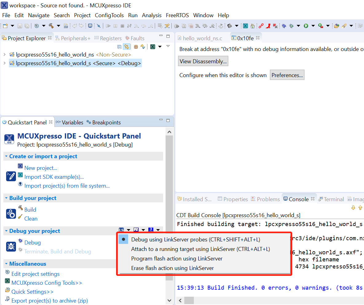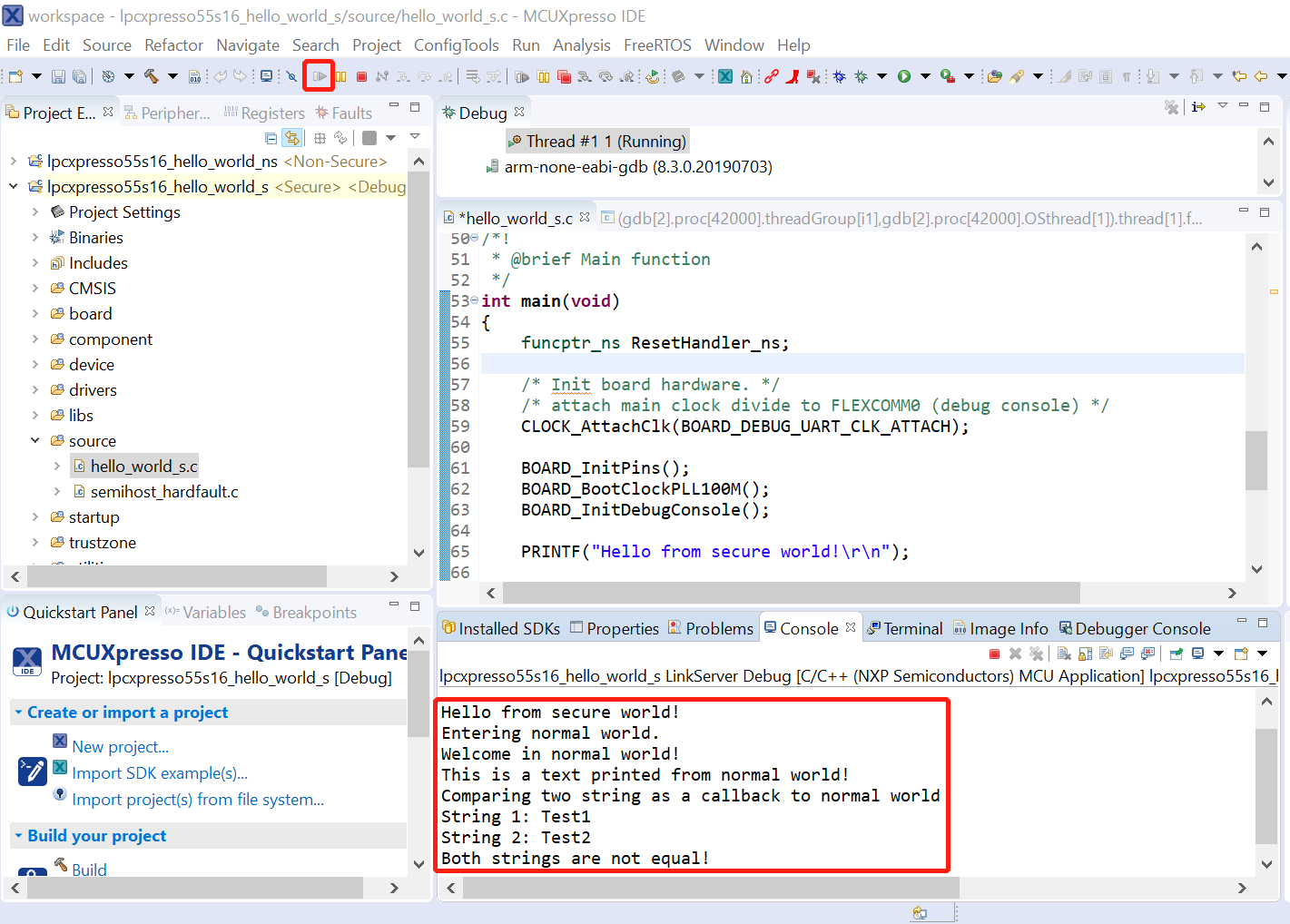 After loading the non-secure application, press RESET on board to release the device connect. Then, highlight the lpcxpresso55s16_trustzone_examples_hello_world_s project (TrustZone master project) in the Project Explorer. In the Quickstart Panel, click lpcxpresso55s16_trustzone_examples_hello_world_s [Debug] to launch the second debug session.