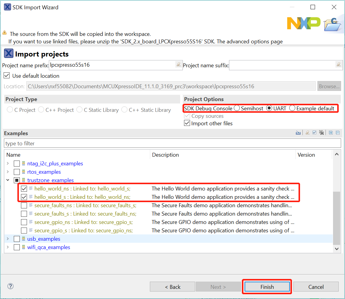 trustzone_examples/folder and selecthello_world_s. Because TrustZone examples are linked together, the non-secure project is automatically imported with the secure project, and there is no need to select it explicitly. Then select UART as SDK Debug Console. Then, click Finish.