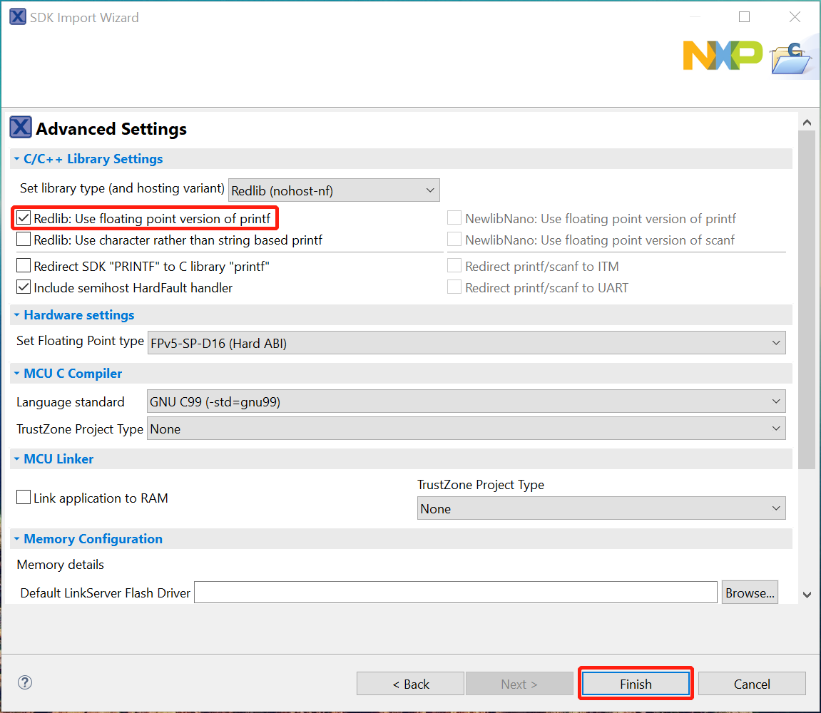 Ensure Redlib: Use floating point version of printf is selected if the example prints floating point numbers on the terminalfor demo applications such as