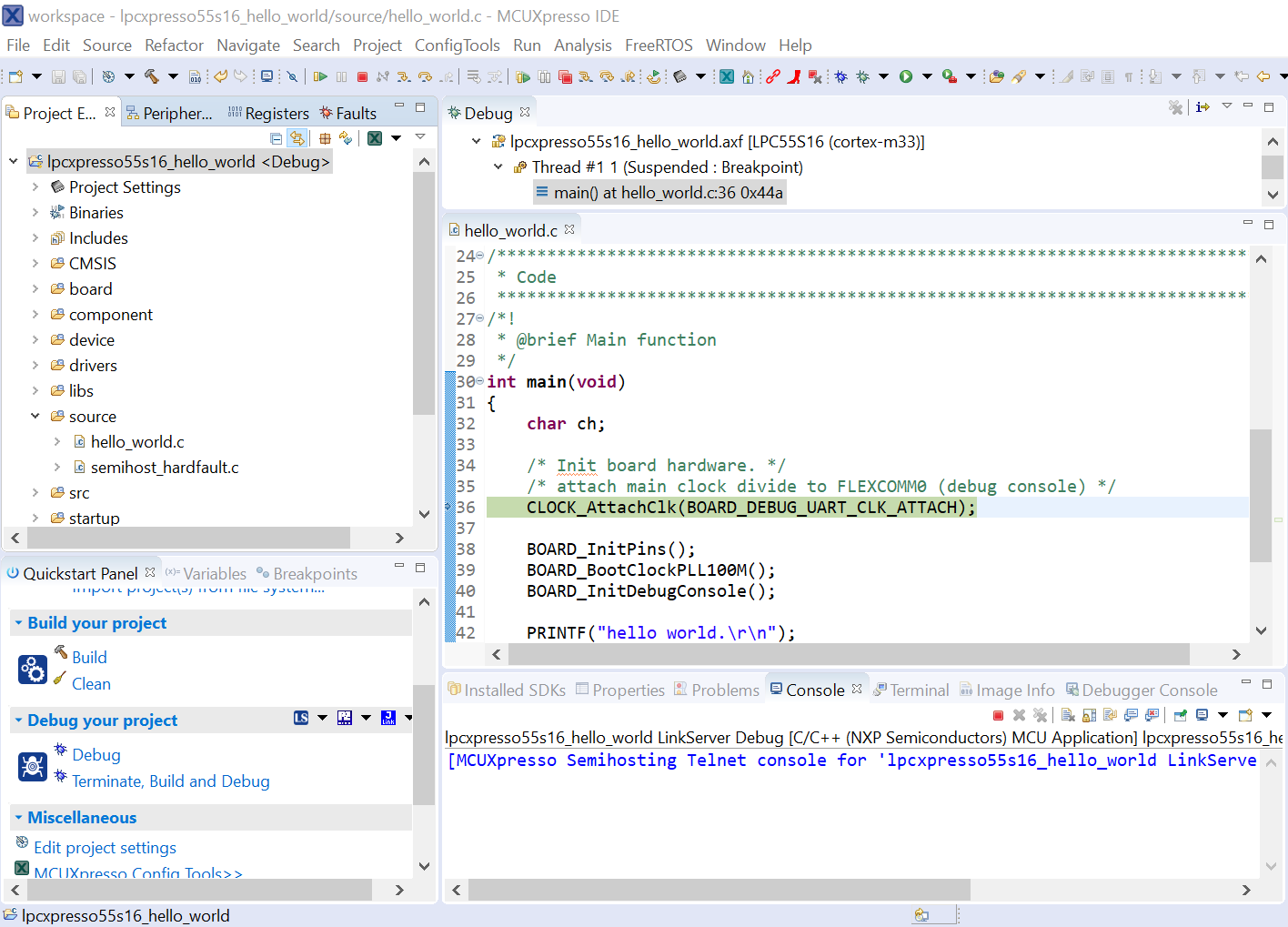 lpcxpresso55s16_hello_world [Debug]to launch the debug session.