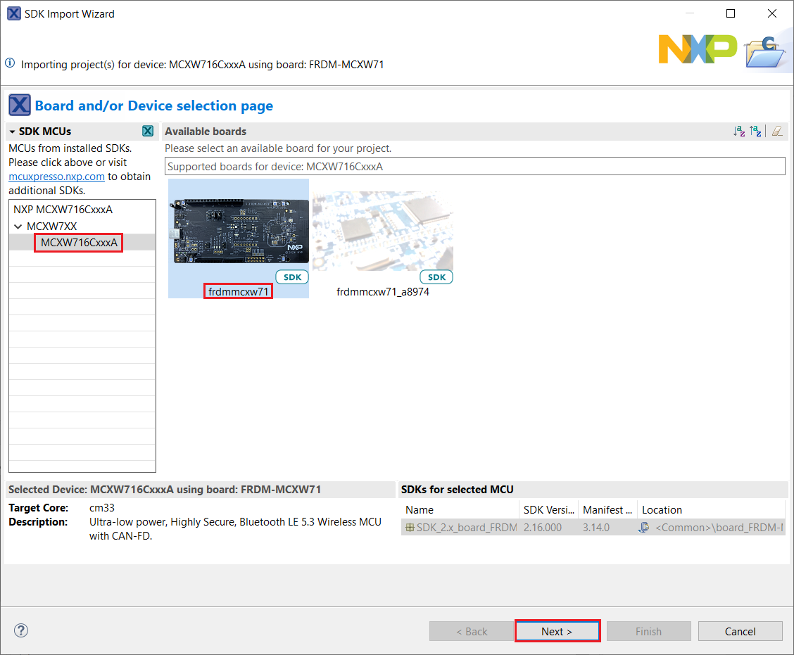 In the window that appears, expand the MCXW7XX folder and select MCXW716CxxxA. Then, select frdmmcxw71 and click Next.