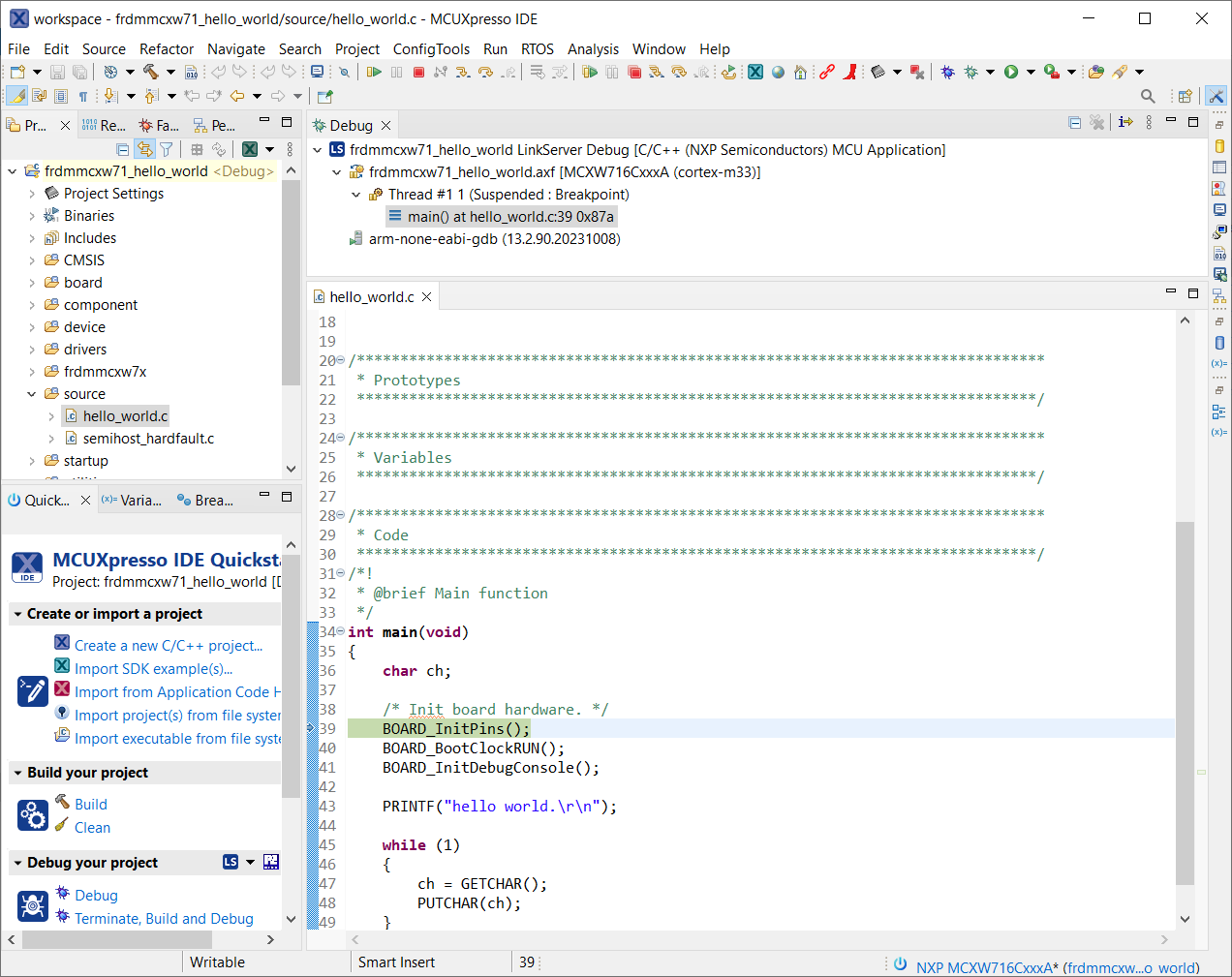This section describes the steps required to configure MCUXpresso IDE to build, run, and debug example applications. The hello_world demo application targeted for the MCXW716 hardware platform is used as an example, though these steps can be applied to any example application in the MCUXpresso SDK.