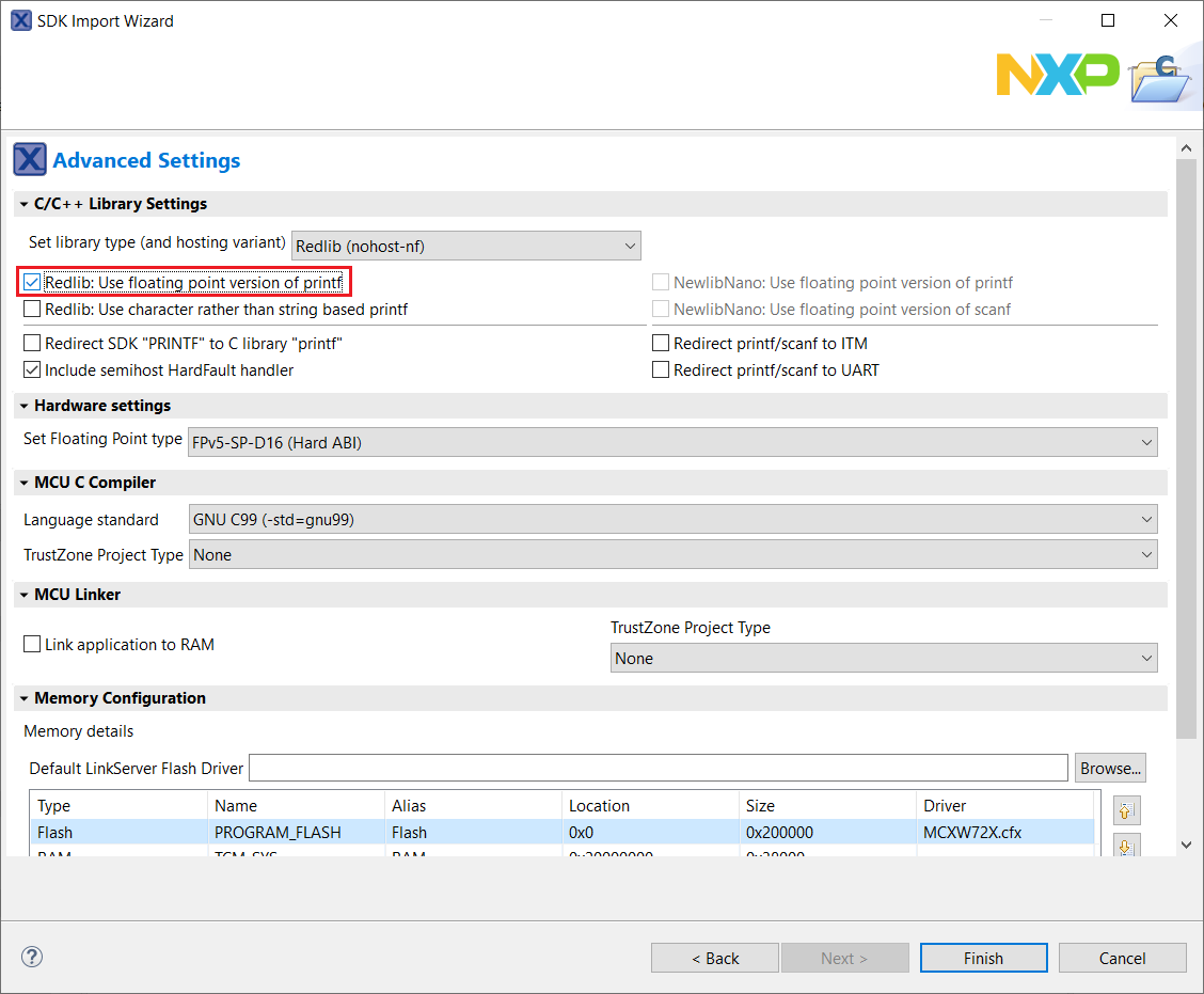 Ensure Redlib: Use floating point version of printf is selected if the example prints floating point numbers on the terminal for demo applications such as