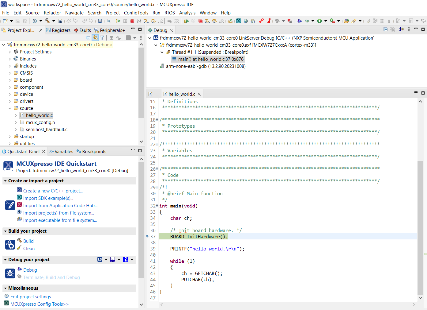 This section describes the steps required to configure MCUXpresso IDE to build, run, and debug example applications. The hello_world demo application targeted for the MCXW72X hardware platform is used as an example, though these steps can be applied to any example application in the MCUXpresso SDK.