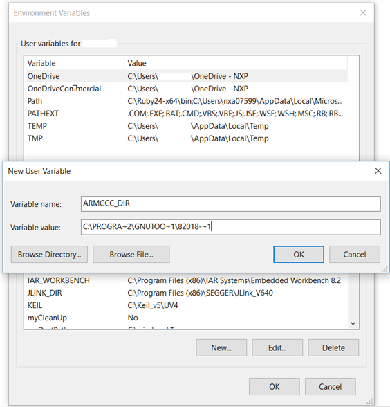 Create a new system environment variable and name it as ARMGCC_DIR. The value of this variable should point to the Arm GCC Embedded tool chain installation path. For this example, the path is: