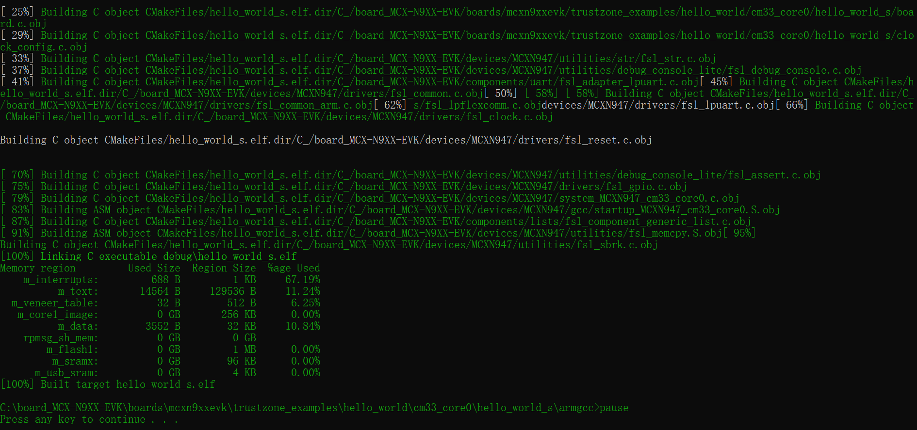 Build both applications separately, following steps for single core examples as described in Build an example application. It is requested to build the application for the secure project first, because the non-secure project needs to know the secure project, since CMSE library is running the linker. It is not possible to finish the non-secure project linker with the secure project because the CMSE library is not ready.