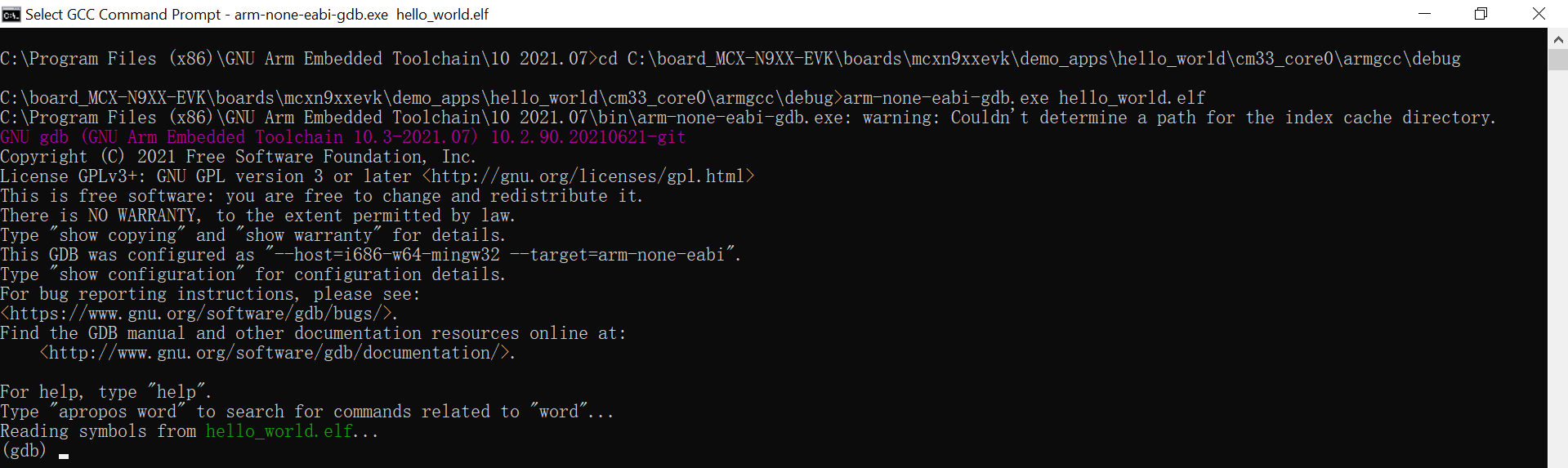 arm-none-eabi-gdb.exe <application_name>.elfcommand. For this example, it isarm-none-eabi-gdb.exe hello_world.elf.