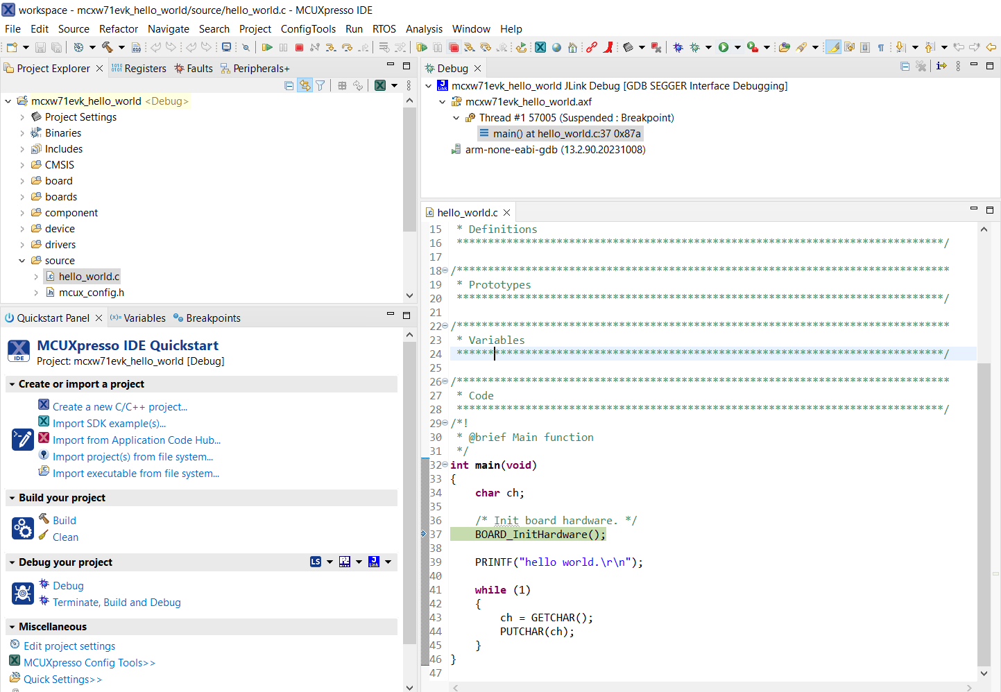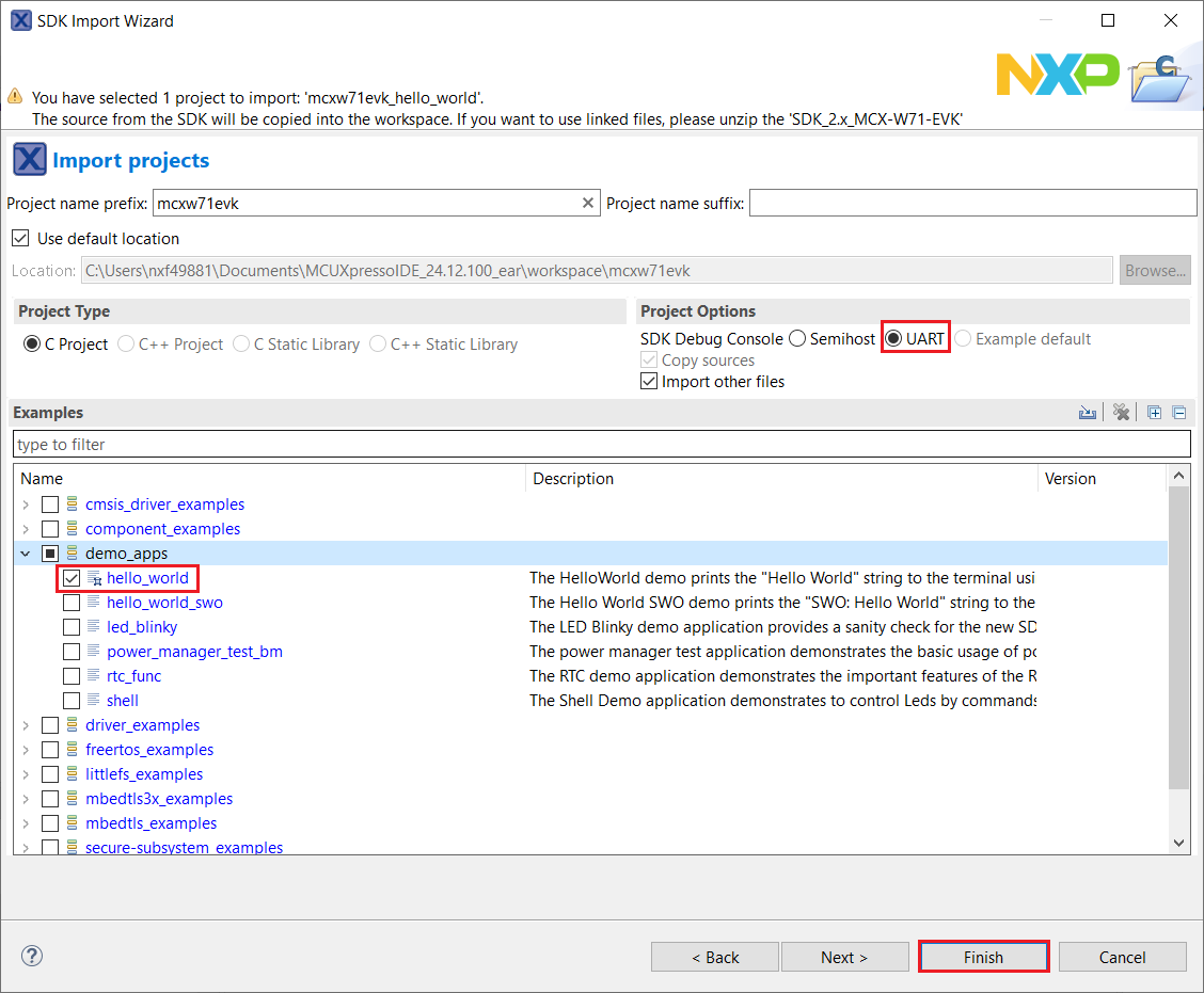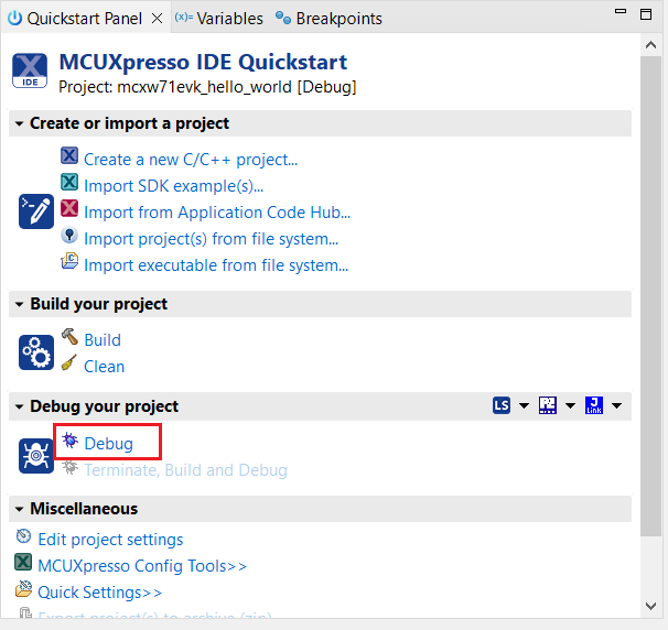 This section describes the steps required to configure MCUXpresso IDE to build, run, and debug example applications. The hello_world demo application targeted for the KW45B41Z-EVK hardware platform is used as an example, though these steps can be applied to any example application in the MCUXpresso SDK.