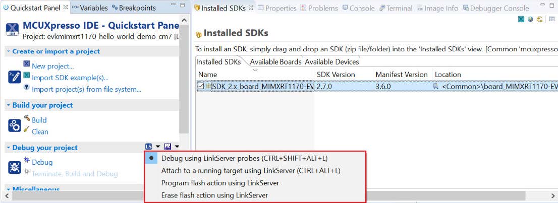 Note: There are some limitations on MCUXpresso IDE debugging. For details, see Section 8.5 MCUXPresso IDE limitation in MCUXpresso SDK Release Notes for MIMXRT1170-EVKB (document MCUXSDKMIMXRT117XBRN).