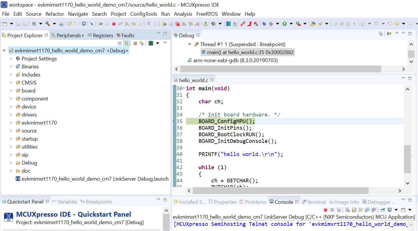 On the Quickstart Panel, click Debug ‘evkbmimxrt1170_demo_apps_hello_world’ [Debug].