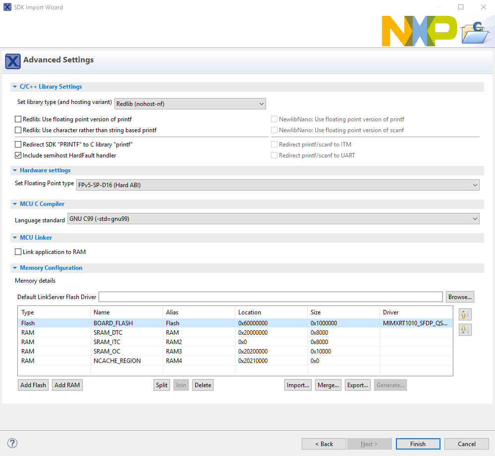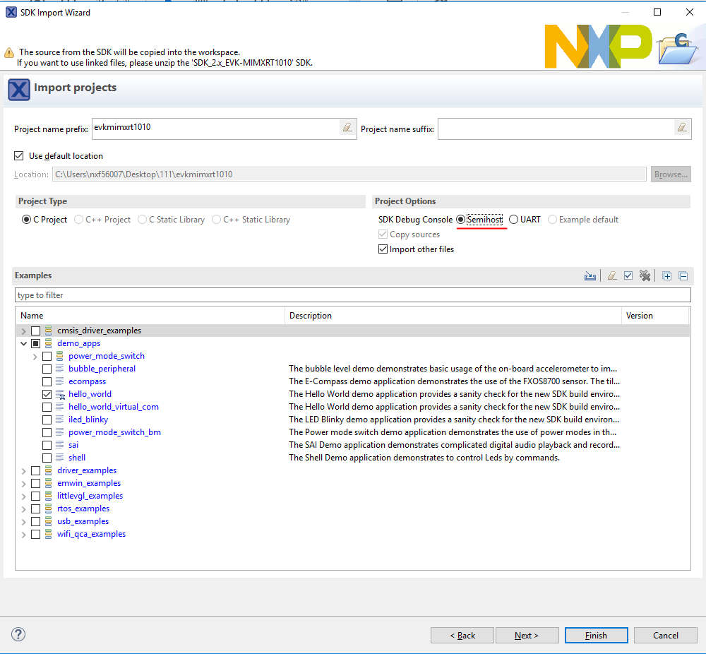 dac32_adc12,dac_adc,dac_cadc,ecompass,sai,coremark,mbedtls_benchmark,wolfssl_benchmark, and formmcau_examplessuch asmmcau_api). Otherwise, there is no need to select it. Click Finish.