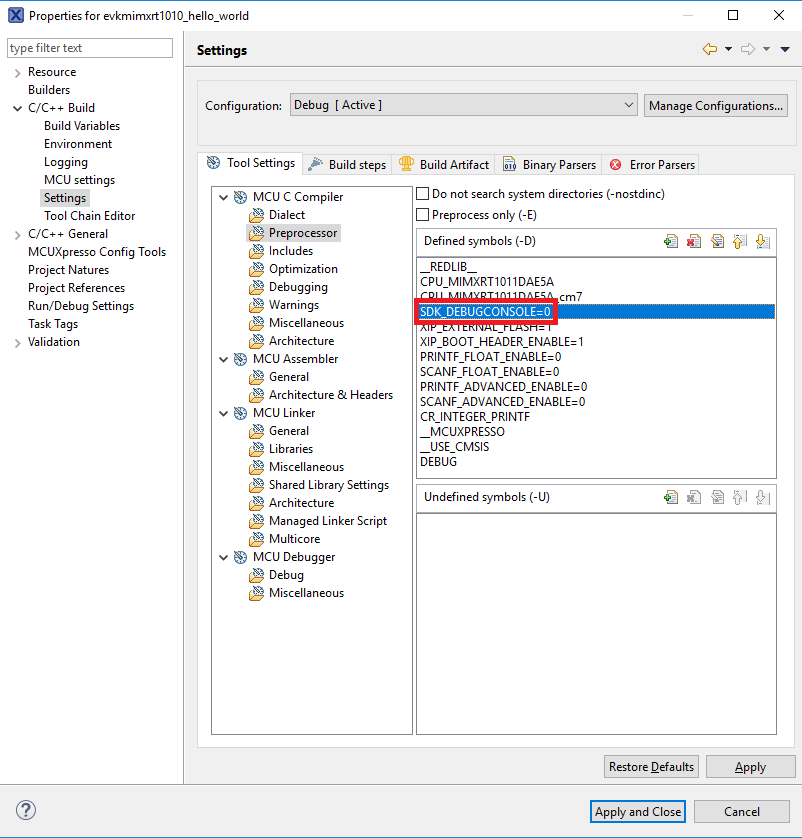 Note: By default, three macros, XIP_EXTERNAL_FLASH=1, XIP_BOOT_HEADER_ENABLE=1, and XIP_BOOT_HEADER_DCD_ENABLE=1, are set in the project. If you do not use Board_Flash in the project, these macros should be removed or set value to 0 in project settings.