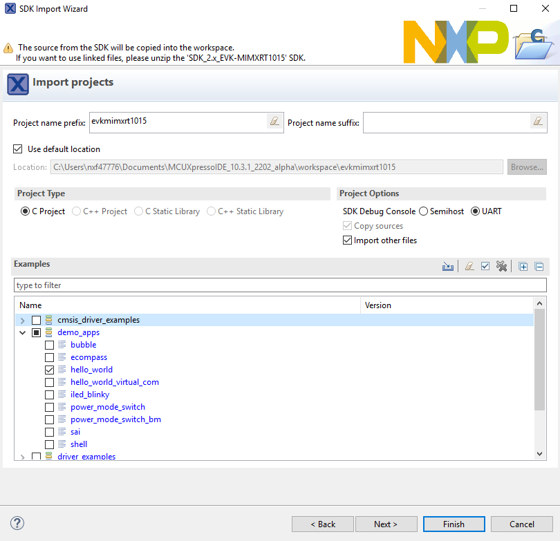 dac32_adc12,dac_adc,dac_cadc,ecompass,sai,coremark,mbedtls_benchmark,wolfssl_benchmark, and formmcau_examplessuch asmmcau_api). Otherwise, there is no need to select it. Click Finish.